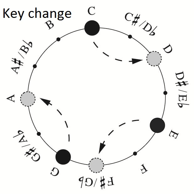 A specific three-note chord is now a set of three whole numbers between zero and eleven. For example, the chord C-E-G is (0,4,7), and the chord C-C# is really either C-C-C# (0,0,1) or, C-C#-C# (0,1,1). The key-change equivalence is now just adding the same number, like two, to each of the numbers in a chord. So here (0,4,7) key-changes to (2,6,9) – C major to D major. Which chord the “major” sphere plays depends on what has been played before.