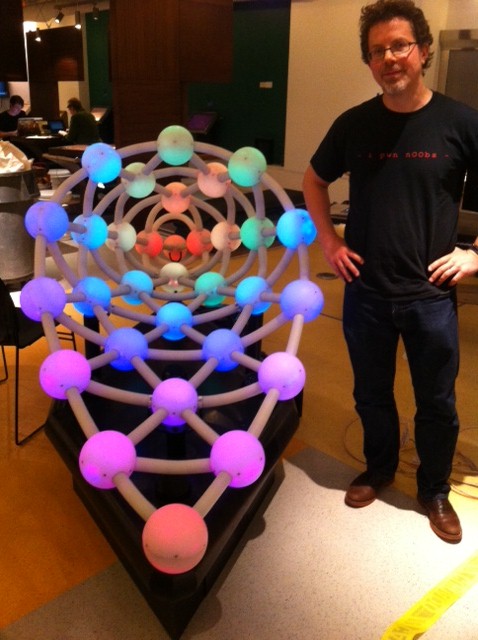 This is composer Dmitri Tymoczko, who teaches at Princeton University. He had the idea for this exhibit and designed it together with a MoMath team. The idea was based on work he did together with Ian Quinn and Clifton Callender.