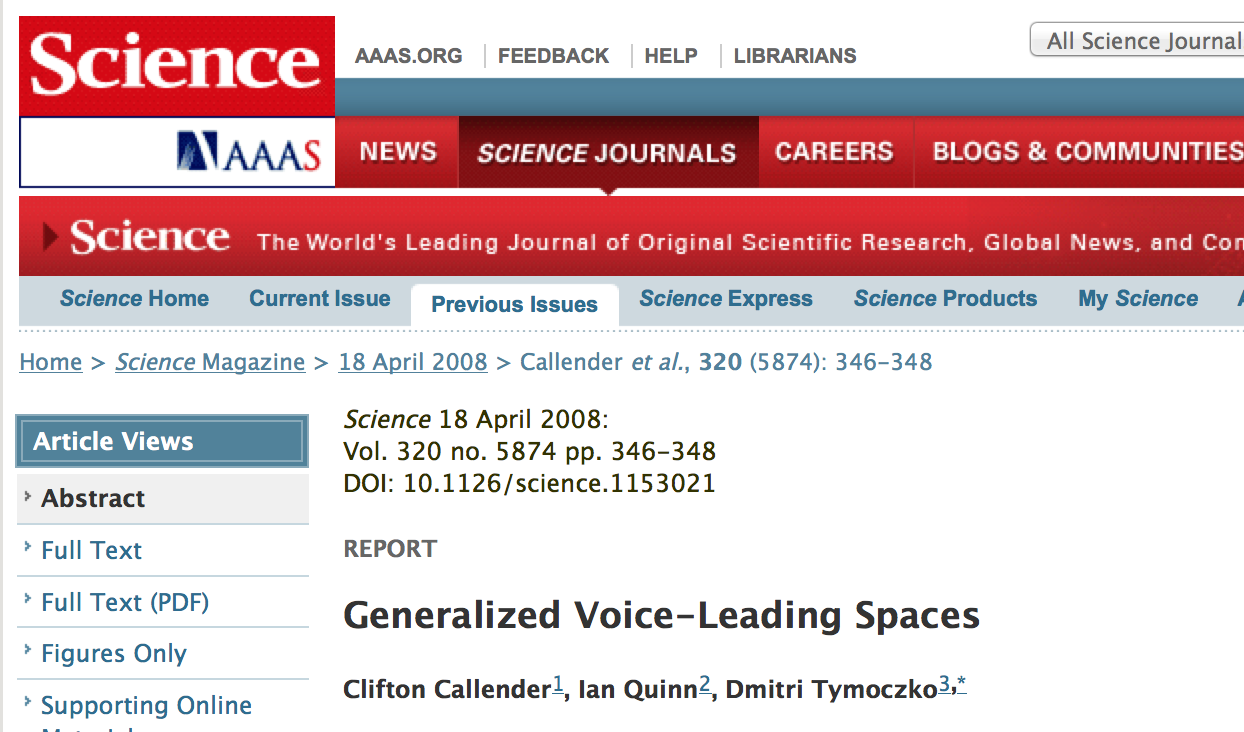 The underlying research which gave rise to the idea of Harmony of the Spheres appeared in the article “Generalized Voice-Leading Spaces,” pages 346-348 of Science, Volume 320 (2008).