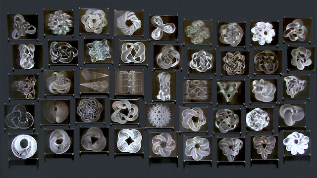 As you walk by the exhibit, millions of glints of light travel along these grooves, and 3D images of mathematical surfaces appear to jump out from the wall. By changing your viewpoint, you can look into and around these images. Or you can animate the entire wall by swinging the lights that illuminate the plates.