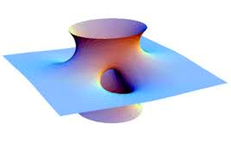 Minimal surfaces are surfaces that, like a stretched rubber sheet or a soap film, reach across their boundaries with minimal surface area. On the wall you see elements of infinite minimal surfaces, which can be extended or repeated and connected infinitely to fill and divide space.
