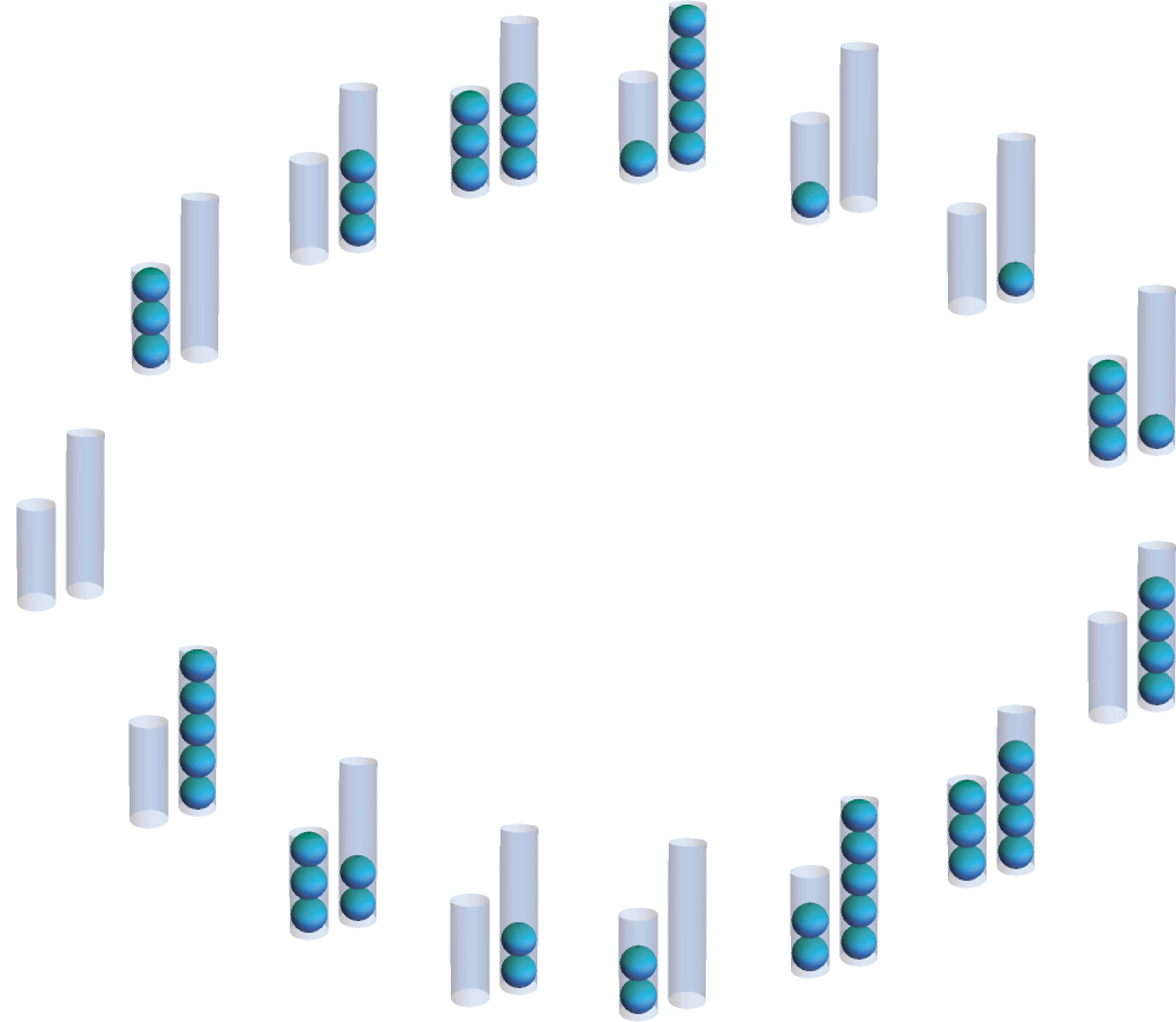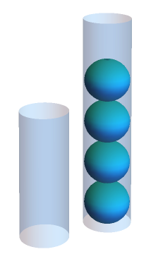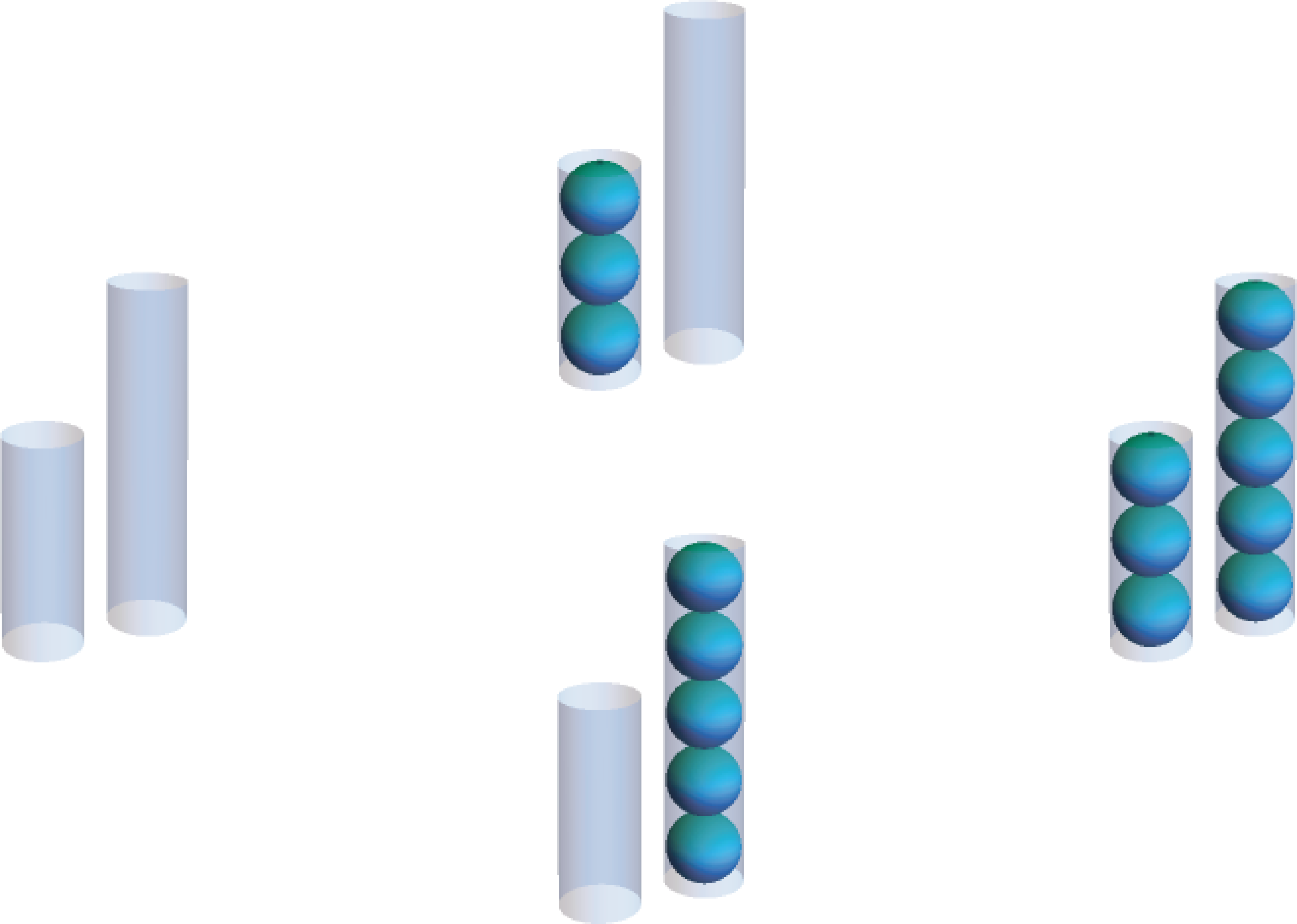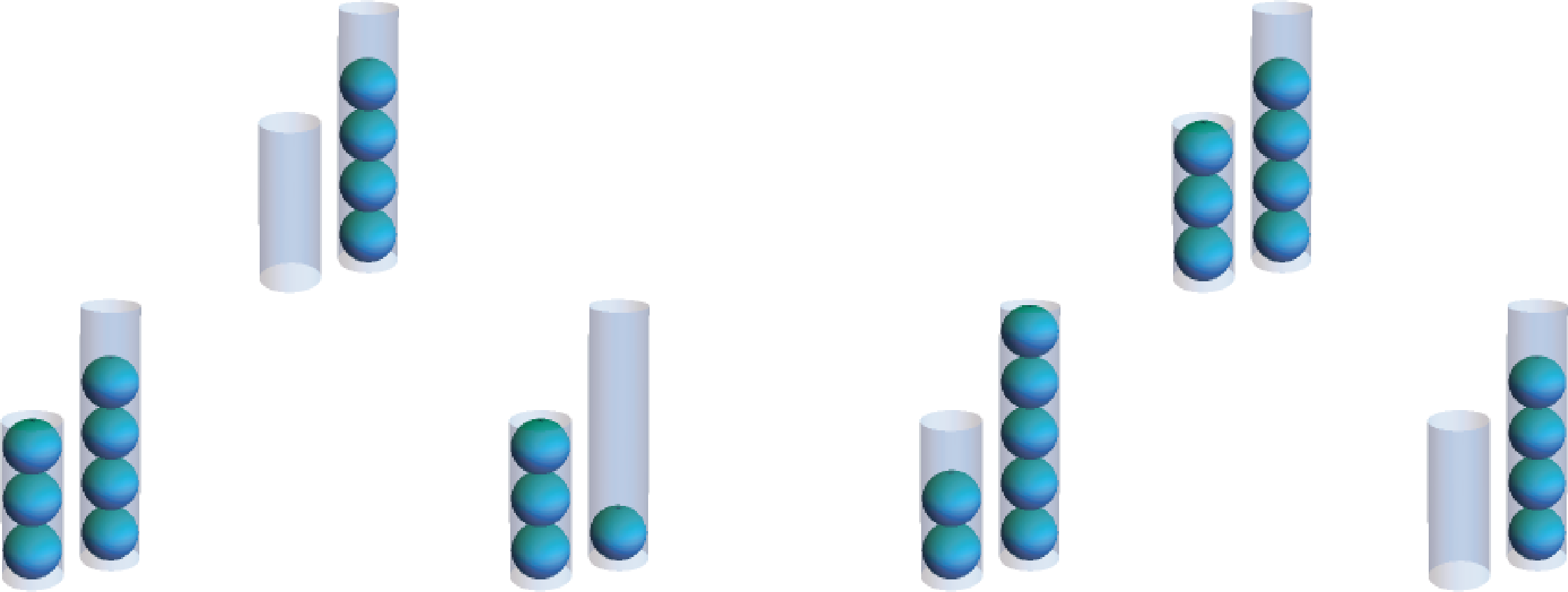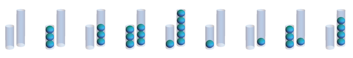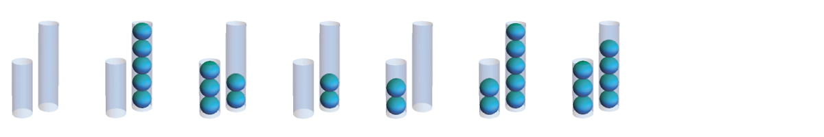 Using these moves, you might stumble upon one of the two solutions to the right. In the top solution, the smaller tube is repeatedly filled and then its contents are transferred to the larger tube. Once the larger tube is full, it is dumped and then the remainder of the small tube’s contents are transferred, resetting the cycle. The lower solution is similar, except the larger tube is filled and its contents transferred to the smaller tube. (Notice that these two solutions together measure all quantities of 1-5 balls along the way!)
