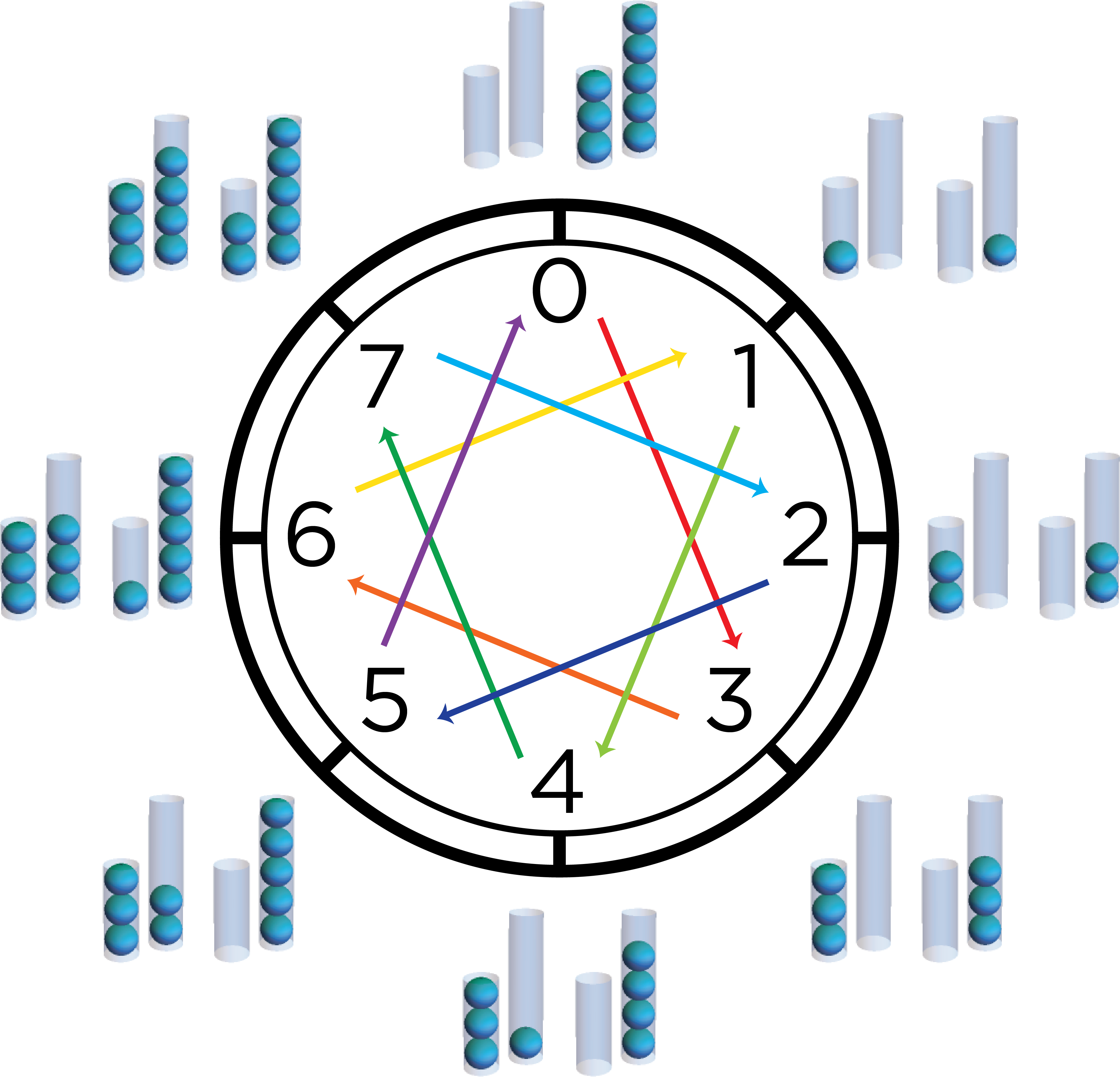 If you keep applying the procedure of filling the smaller tube and transferring to the larger after you’ve successfully measured four balls, you’ll find that you end up reproducing the procedure of filling the larger tube and transferring to the smaller tube in reverse! Notice that in this cycle the larger tube ends up measuring every quantity from 0-5 balls. Does such a procedure exist for every pair of tubes?