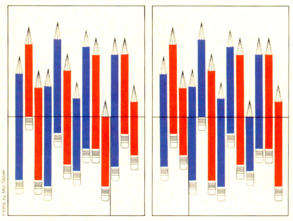 Here is another geometrical vanish created more recently (1956) by Canadian puzzle maker Mel Stover. On the left there are six blue pencils and seven red pencils. But when everything below the line is shifted three places (the picture on the right), there are seven blue pencils and six red pencils.
