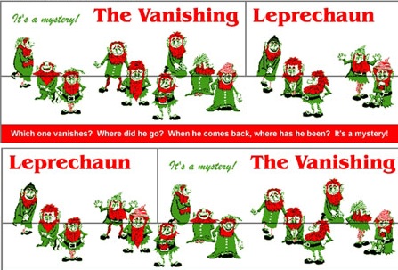 This is another famous geometrical vanish: “The Vanishing Leprechaun,” created by Ms. Pat (Patterson) Lyons in 1968. The two sections of the top half of the puzzle (divided by a vertical line) switch places, and a leprechaun disappears!
