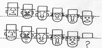 Take another look at the red monkeys playing in front of you, with the handle on the left side. If this big circle were a clock, there would appear to be a monkey at 10:00. But when the handle is pulled to the right side, there is no longer a 10:00 monkey. This monkey is like the last man on the face puzzle on the previous page, except not a single piece of him is above the dotted line – not a paw, not a tail, not event a top hat! The entire monkey leaves the 10:00 position (just like the last man in the previous example would if he didn’t have a hat) and nothing replaces him.