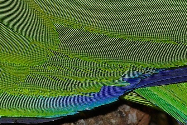 Strong moiré patterns are visible in the fine detail of a parrot’s feathers. This image is enhanced with some sharpening.