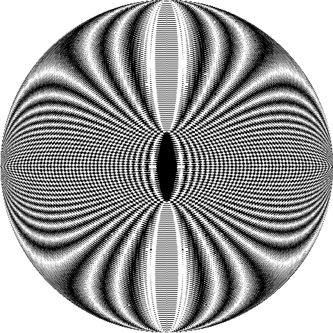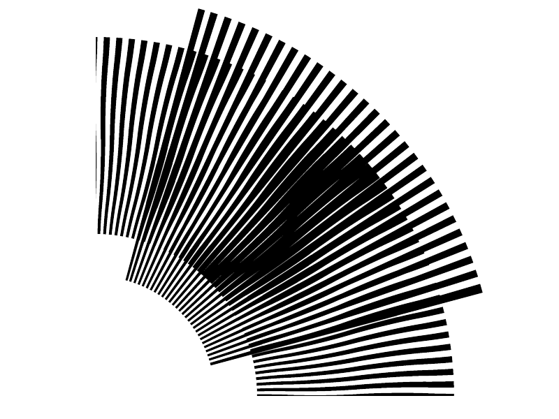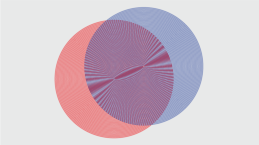 The relationship between the original patterns and the moiré patterns they create often isn’t simple. In fact, they can be very surprising! For example, moiré patterns fromed from concentric circles can produce patterns of parallel lines, ellipses, or hyperbolas. Moiré patterns formed by two sets of radial straight lines can produce circles!