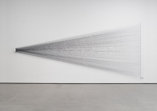 “Moiré tape,” an installation by Carsten Nicolai, consists of two radial gratings of lines superimposed onto each other on the wall of a gallery.
