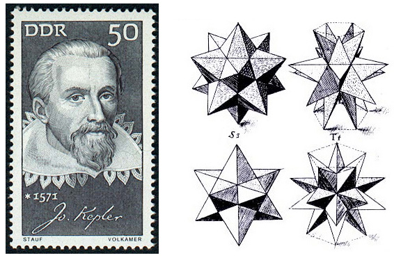 The famed astronomer Johannes Kepler (1571-1630) was the first to mathematically investigate solids with regular polygon faces, as well as some of their stellations. He proved there are only 13 Archimedean solids, along with two infinite families of prisms and antiprisms. The “star” solids he derived as stellations of the dodecahedron are named Kepler polyhedra. His drawings of the two stellated dodecahedra (Ss and Tt) shown here are from his treatise Harmonices Mundi , Book II (The Harmony of the World, 1619).