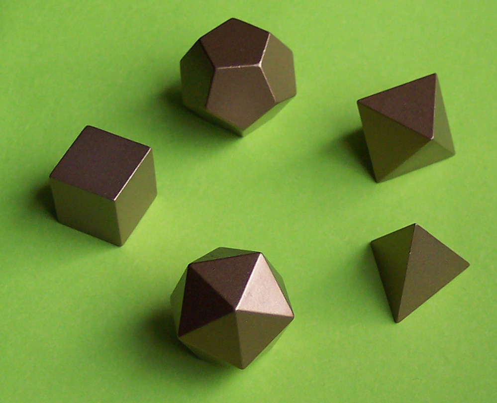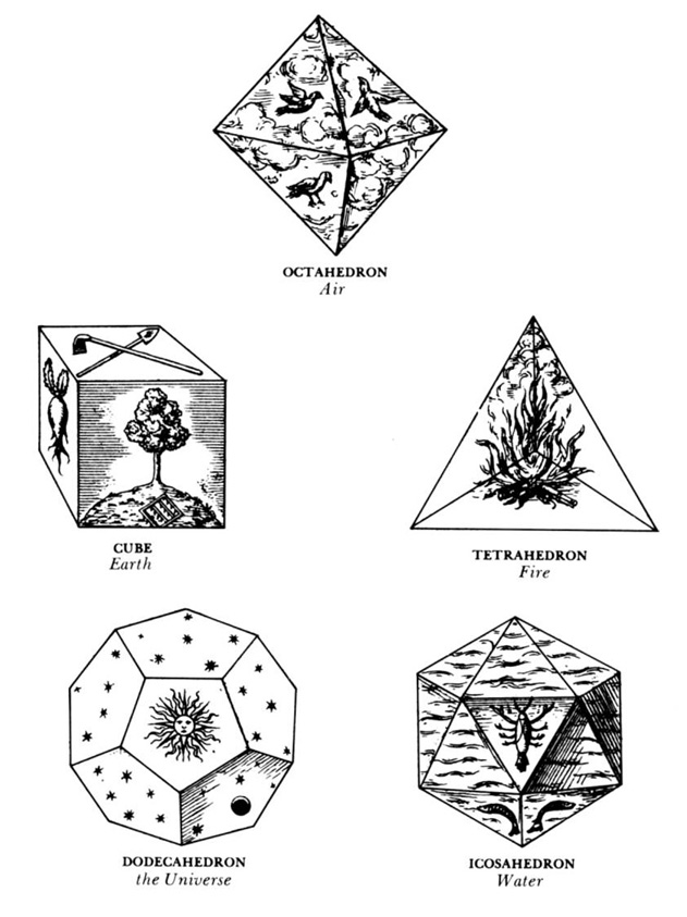 Why are the regular polyhedra called the Platonic solids? The answer is found in the dialogue Timaeus (ca. 350 BCE) by the Greek philosopher Plato, who revered perfection of form. He theorized that the classical elements (fire, air, water and earth) were constructed from these regular solids. The tetrahedron represented fire (fire feels sharp and stabbing like a tetrahedron). Air is made of the octahedron, water the icosahedron, and earth the cube. With no classical element for the dodecahedron, he obscurely remarks “the god used [this] for arranging constellations on the whole heaven”. Thus the dodecahedron can represent the universe. Johannes Kepler illustrated these assignments his 17th century treatise Harmonices Mundi.