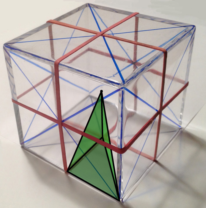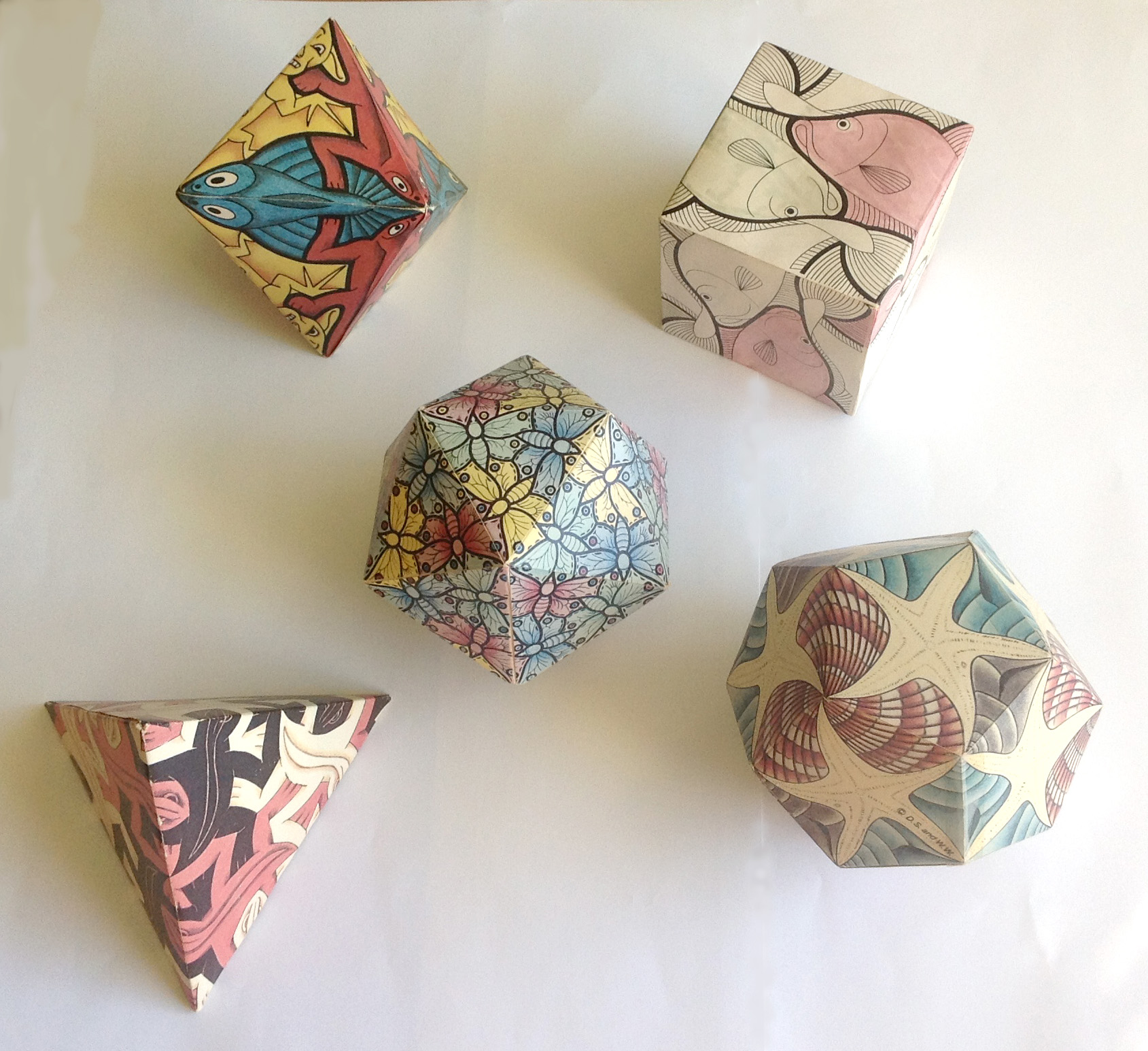 How many ways can you cut a cube exactly in half with a flat mirror so that the two parts reflect onto each other? The mirror is a reflection plane, and the reflection is a reflection symmetry. Reflection planes divide the cube into 48 tetrahedra, all the same. Reflection planes of the cube are outlined in the picture, and one tetrahedron displayed. The cube also has rotation symmetries; it can be partially turned around an axis that pierces through its center and then look as though no turning took place. Where are the rotation axes located on the cube? What is their least angle of turning? Can you find reflection and rotation symmetries of other Platonic solids? Some symmetries of the Platonic solids are shown in the Escher-decorated models.