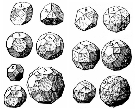One surprising place where Platonic solids can be found in nature is in a minute marine life form called a radiolarian. These are mineral skeletons of single-celled life forms. They were discovered by Ernst Haeckel on a sea expedition in 1873-1876. His careful drawings show that a number of species of radiolaria were shaped like the Platonic solids. Some examples include Circoporus octahedrus, Circogonia icosahedra, Lithocubus geometricus and Circorrhegma dodecahedra. Their names identify the Platonic solid for which they are named. The illustration is taken from several plates in Haeckel’s Report on the Scientific Results of the voyage of H.M.S.Challenger, vol 18, London 1887.