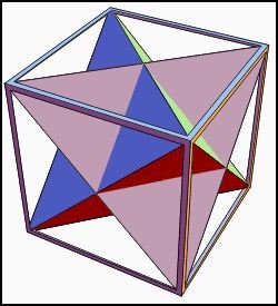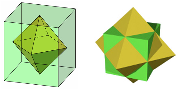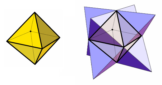 If you choose the octahedron and imagine each triangle face expanding outwards, something magical happens when the extended faces intersect. At that moment, a new star-shape appears, called a Stella Octangula. This process of growing the faces of a polyhedron outward until they intersect is called stellation— it can create a star-like form. Try it with the dodecahedron. Try it with the icosahedron. What happens when you try it with the cube? The tetrahedron?