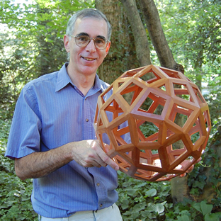 George Hart is a mathematical artist who uses his computer science knowledge to create geometric sculptures based on polyhedra. He creates imaginative forms buildable in “barnraising” events in which groups assemble the structures from like pieces. He also “prints” with a 3-d printer, creating sculptures that would be impossible to build by hand. His web site is rich with information about all the symmetric polyhedra (Encyclopedia of Polyhedra), as well as his sculptures, publications, and hosted events. His puzzle-sculpture “Frabjous” is sold in the Museum shop.