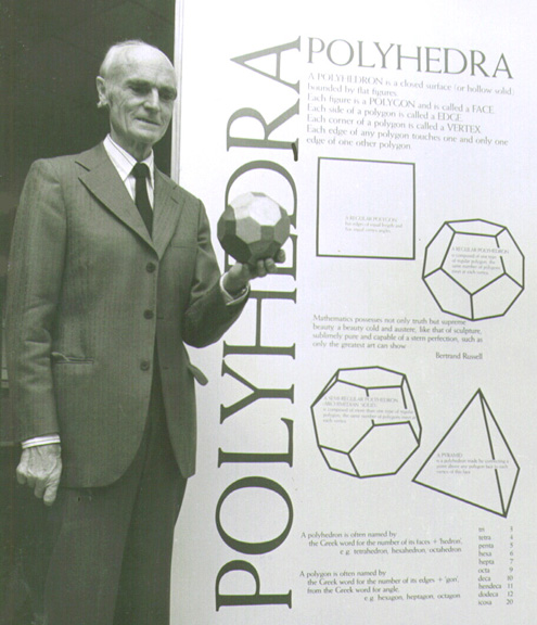 Harold Scott MacDonald Coxeter, a professor at the University of Toronto for 60 years, was one of the foremost geometers of the 20th century. He was devoted to researching and teaching all aspects of geometry and is especially noted for his work on regular polytopes. Regular polytopes are the regular polygons in the plane, regular polyhedra in 3-space, and their higher-dimensional counterparts. in his lifetime, he had more than 200 publications on subjects in geometry. Two that are directly related to polyhedra in the Mathenaum are The 59 Icosahedra (the various stellations of the icosahedron), 1938, and Uniform Polyhedra, 1954.