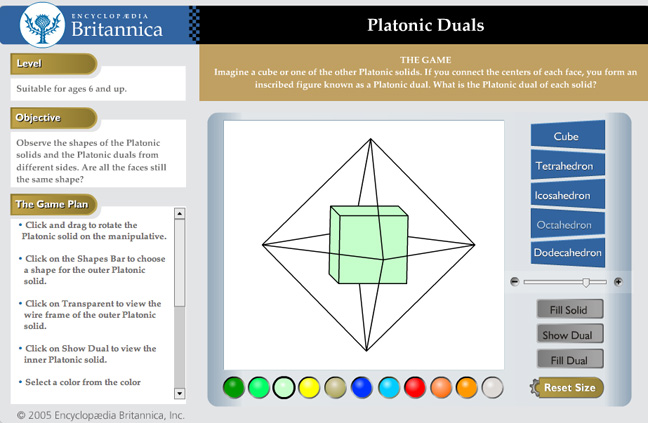 Platonic Duals, on the Encyclopedia Britannica web site http://kids.britannica.com/lm/manipulatives/enu/workspaces/platonic_duals/product.html is a nice interactive demonstration of duality of the Platonic solids.