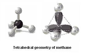 An action on an object that leaves the image unchanged is called symmetry. In chemistry, the symmetry of molecules is used to classify and study their behavior. From the symmetry of a molecule, a chemist can predict or explain many of the chemical’s properties. Molecules that have symmetries equivalent to the symmetries of the platonic solids are special because they can be rotated on several axes with the image remaining unchanged. An example of a molecule with the same symmetries as a tetrahedron is the methane molecule shown here. Can you see the resemblance between methane and the tetrahedron?