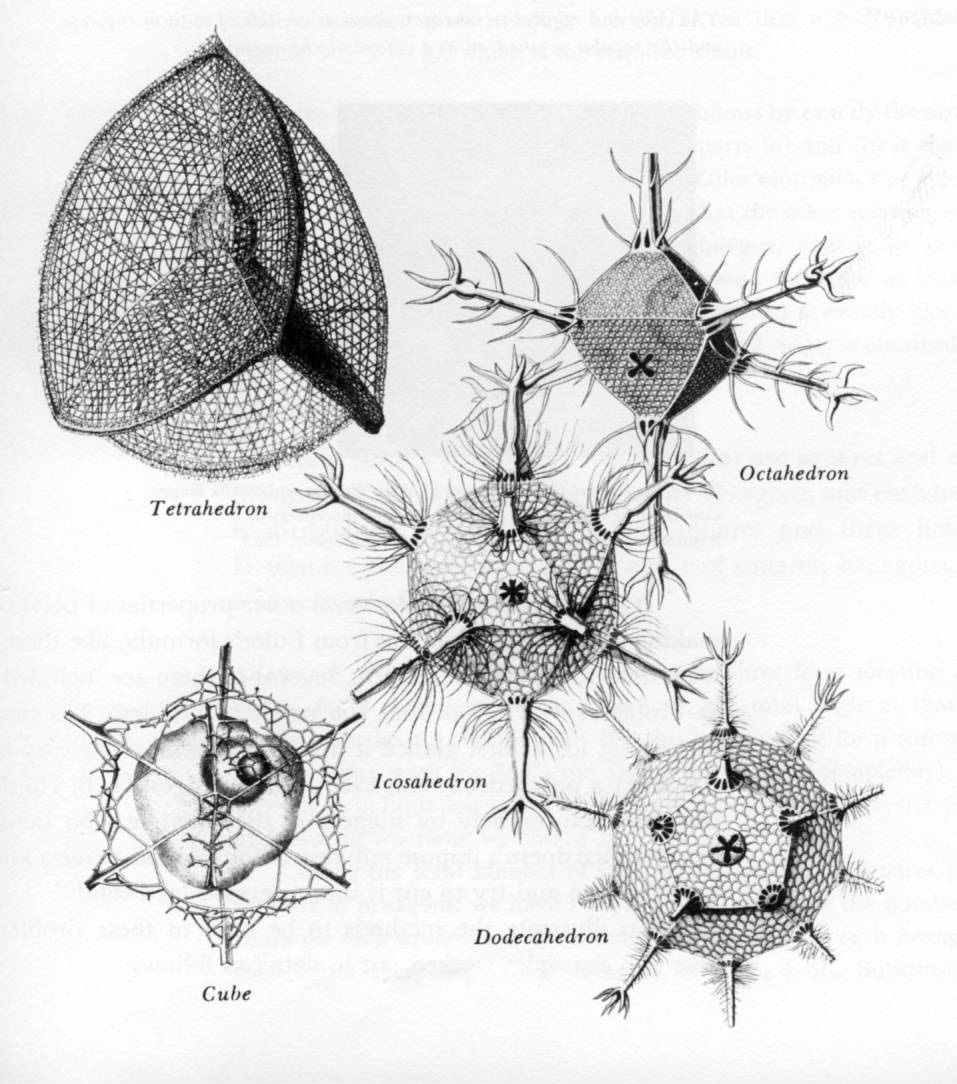 Ernst Heinrich Philipp August Haeckel was a biologist who studied thousands of species. Among those were very small single-celled life-forms called the Radiolarians. These creatures measure in diameter of 0.1-0.2mm and have extremely intricate skeletons. Some members of this species have shapes that resemble the platonic solids. These include: Circoporus octahedrus, Circogonia icosahedra, Lithocubus geometricus and Circorrhegma dodecahedra. It was Ernst Haeckel’s drawings in his book Die Radiolarien (Berlin, 1862) that helped to popularize these creatures and spurred further study.