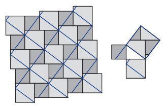 The above is a picture of Annairizi of Arabia’s tiling proof of the Pythagorean Theorem. Notice that if you remove the grid consisting of blue lines, you yield the Pythagorean Tiling highlighted in the previous painting. Can you see how this demonstrates the theorem? See More Math for more on picture proofs.