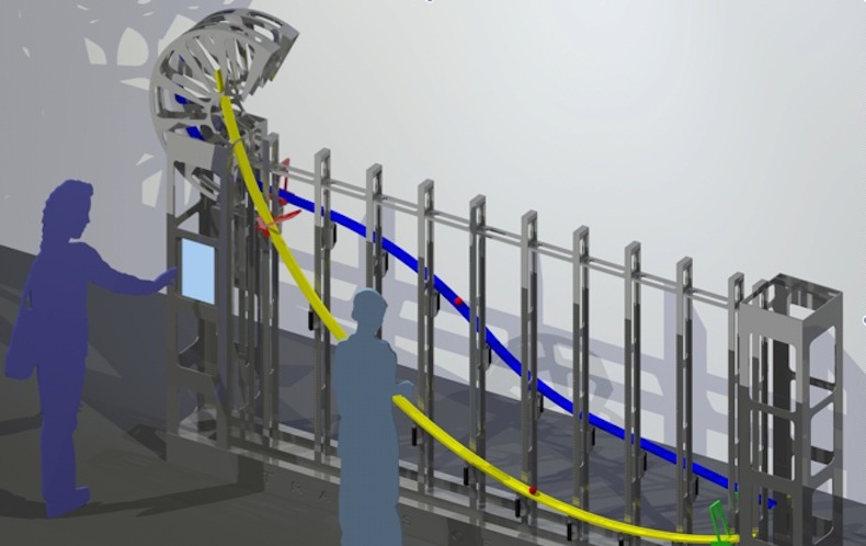 What gets the cart rolling? It doesn’t have a motor so instead it relies on gravity to make it move. Gravity is something that physicists call a force. That means that when a light object – like a cart in Tracks of Galileo – is given the opportunity to get closer to a very, very massive object – in this situation, the Earth – it will. And it will move towards it at faster and faster speeds the farther it falls, meaning that it accelerates. The farther the cart falls, the faster it will roll.