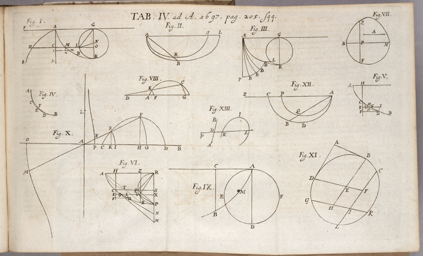 This is a page from the article written by Johann Bernoulli about his and others’ solutions to the brachistochrone problem. The first three figures are Bernoulli’s solution. The other images are the solutions Bernoulli received from his brother, Jacob Bernoulli, Guillaume de L’Hôpital, René Descartes, and Isaac Newton.