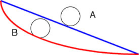 The top blue curve – the straight line – may be the shortest distance between the start and the finish, but the red curve – the upside down cycloid – is actually the fastest track. Which of the two blue curves do you think makes the faster track?