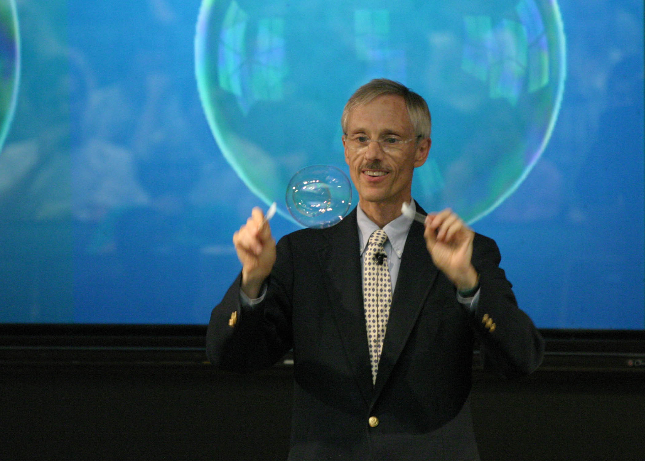 Frank Morgan is a professor of mathematics at Williams College. Along with teaching college students and writing books about math for all kinds of readers, Frank studies bubbles. What fun! To do this, Frank uses calculus of variations – the mathematics involved in this exhibit.