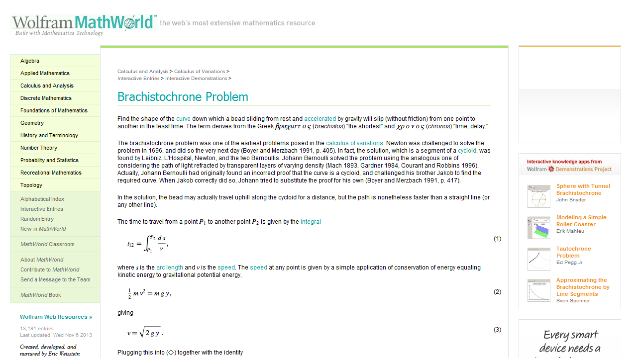 This page from Wolfram Math World provides an advanced discussion of the history and mathematics behind the brachistochrone problem. The full calculus of variations derivation of the cycloid curve can be found here.