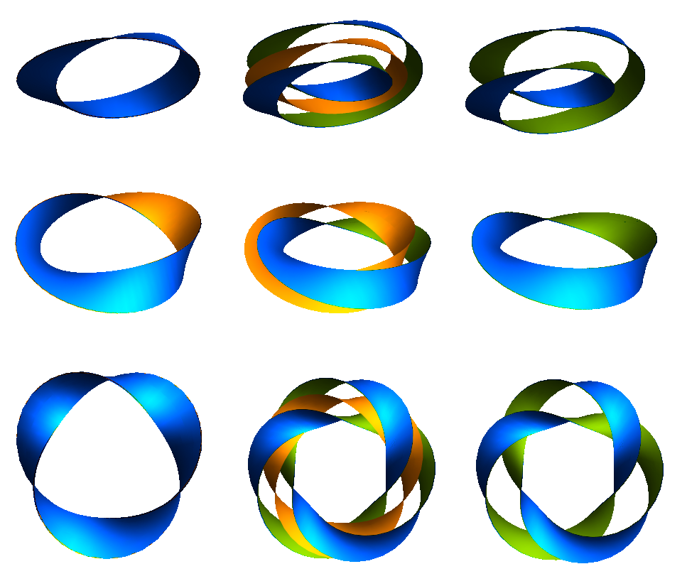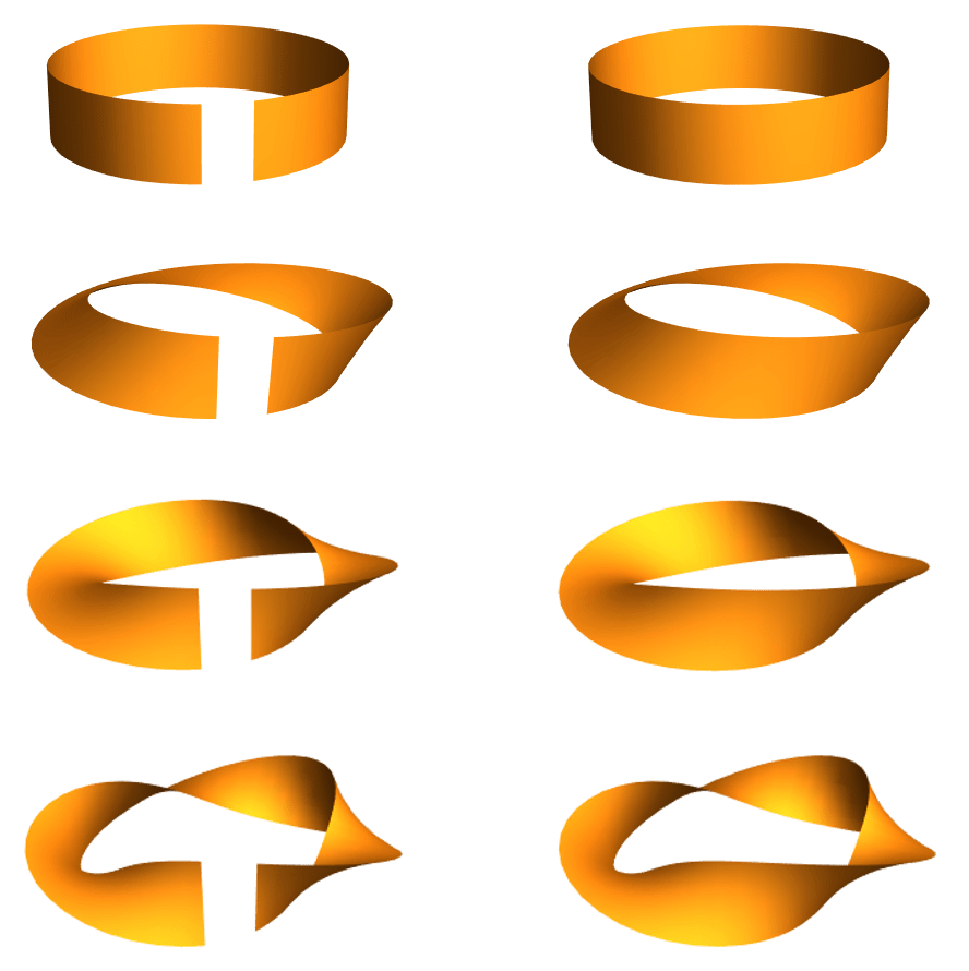 While there’s no difference between zero and two twists in a 2D world, there is in 3D. Have you ever tried wrapping a rubber band around a rolled up paper? It’s easy to imagine what it would look like if you were to wrap once around. However, if you wrap the rubber band around a second time, you’ll find that it no longer lies flat. It certainly has to cross over itself in order to double-wrap, but what’s with the twist in the band? No matter how you try to straighten out the twist, it just moves elsewhere or spreads out. If you try wrapping it around a third time, about half the time it just gets more impossibly twisted. The other half the time, with some gentle coaxing, it lies flat again!
