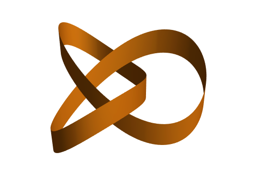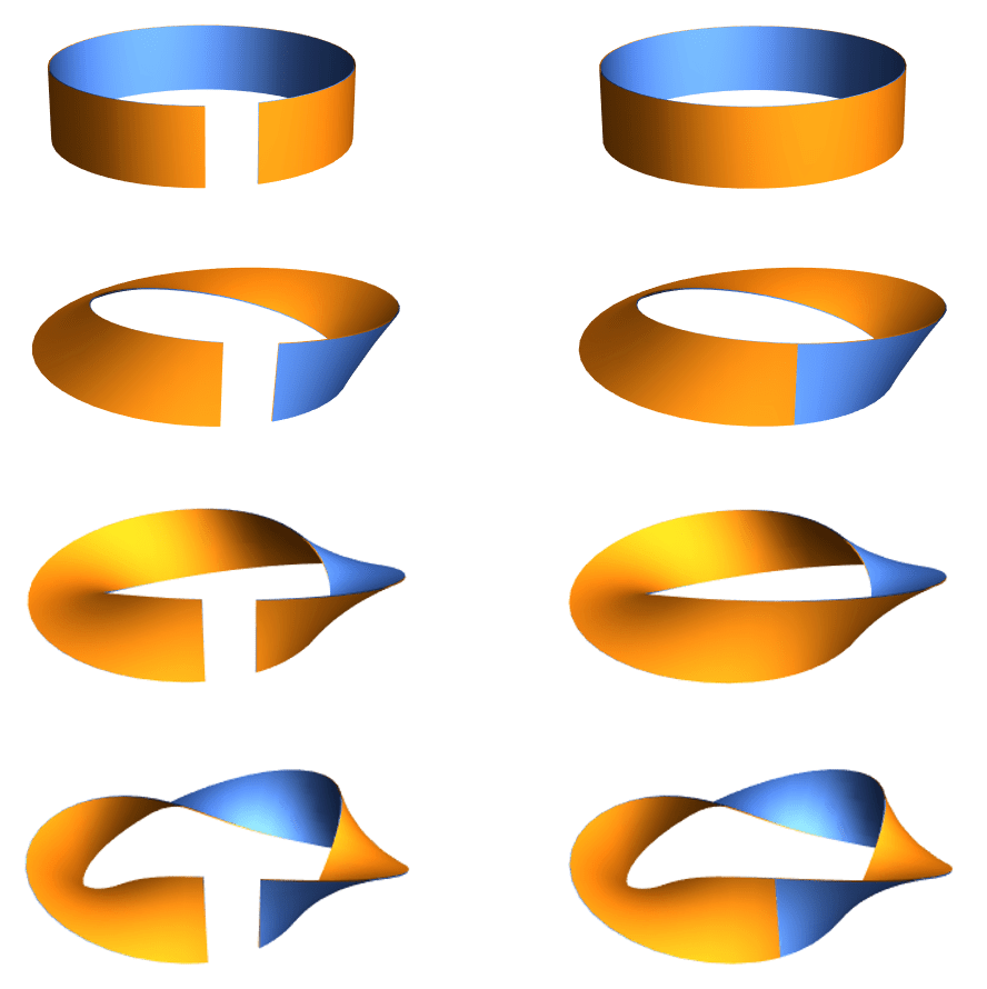 As we twist the strip, the end we’re twisting switches from orange to blue. This means that after an even number of twists, we’ll see orange line up with orange, while after an odd number of twists, orange will line up with blue. An even number of twists results in a surface where there is still an orange side and a blue side, so we can still talk about sidedness — like the front and back of a strip or the inside and outside of a cylinder. An odd number of twists, on the other hand, creates a surface that has only one side, since we can see that blue and orange are now on the same side!