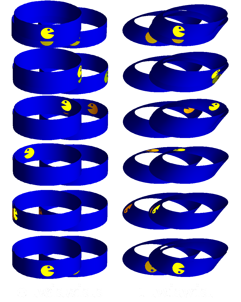 If we explore how Pac-Man navigates strips of varying twists, another pattern emerges. Just as an odd number of twists gave a one-sided band while an even number of twists gave a two-sided band, even-twisted bands are orientable while odd-twisted bands are nonorientable. While we can see a difference between an untwisted band and a twice-twisted band, what does Pac-Man see? Since he doesn’t have access to our 3D glasses, perhaps he can’t tell the difference.