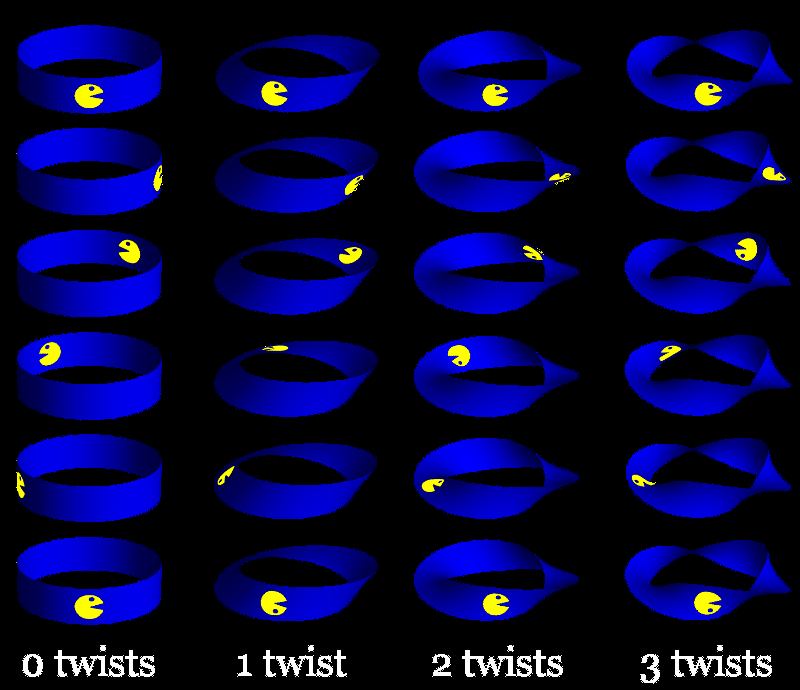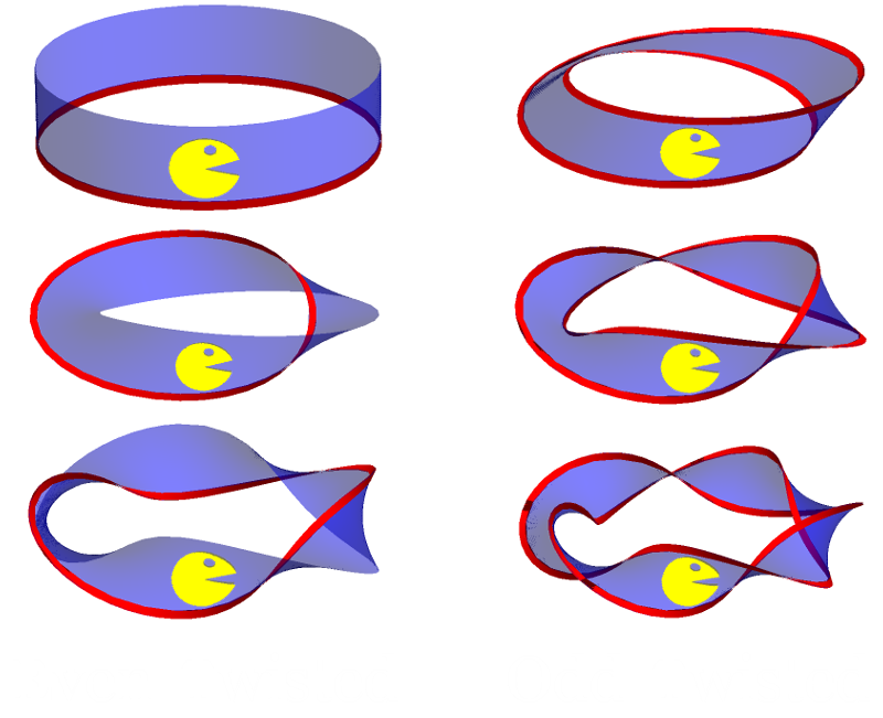 If you’ve ever played Pac-Man, you might recall that he can roll off one side of the screen and take a hidden passageway to the other side. To the right are two possible paths Pac Man might take to end up back where he started. In the cylindrical path, we see him start in front, work his way around the back, and then reemerge front and center. A similar thing happens on the Möbius strip path, but something’s a little off. If you look closely, his eye is now on the bottom of his head! No matter how he rotates, he will continue to be the mirror image of the Pac-Man who started this journey. If he could flip like a coin, he’d be back to his old self, but he can’t flip out of the 2D strip. He can always take another lap around the Möbius strip to set himself straight, though!