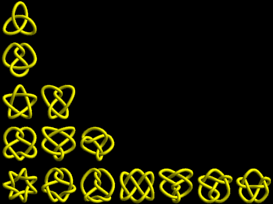 Just as any integer can be factored into a product prime numbers, similarly any knot can be factored into a connected sum of prime knots. To the right is a collection of some prime knots arranged by crossing number, which is the least number of times that a knot can cross over itself when placed on a table. An unknot can cross over itself, but because we can maneuver it so it doesn’t, its crossing number is 0. The trefoil has crossing number 3, which is the lowest crossing number of any nontrivial knot. (If you see a knot with 1 or 2 crossings, it must be the unknot in disguise!)