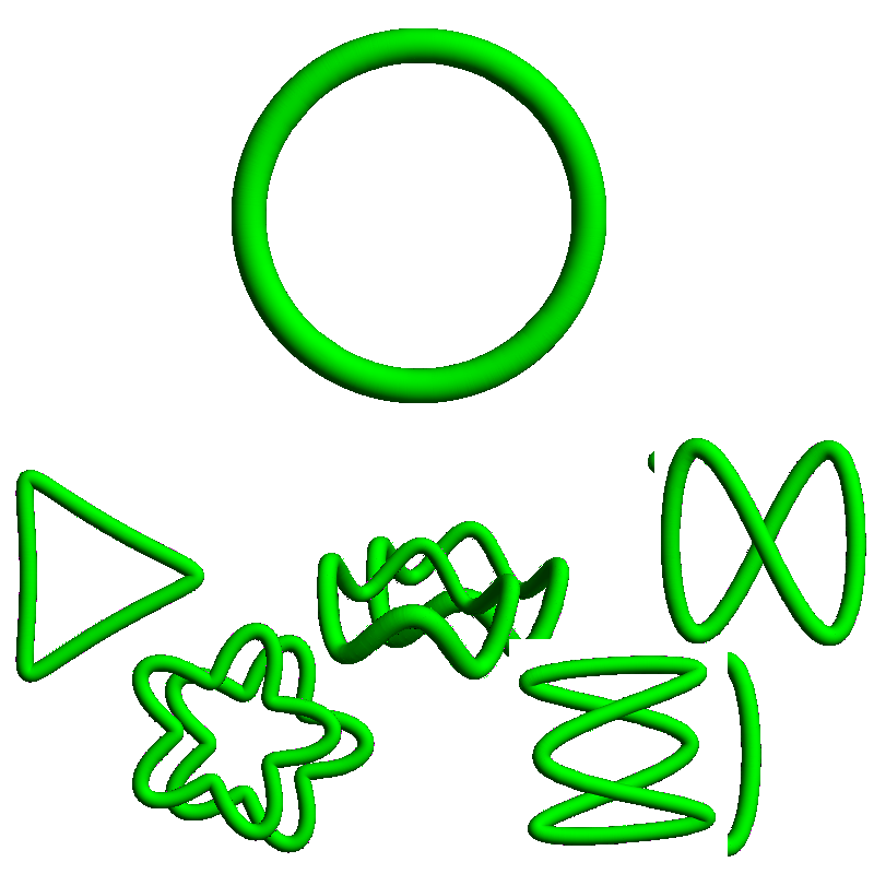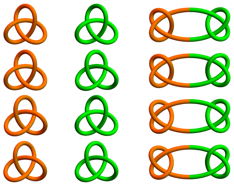 So far we’ve seen the unknot and trefoil. What are some other knots? One easy way to make a new knot is to tie several knots into the same loop, forming what is called a composite knot. Even with two trefoils this is already a little complicated. This is because the trefoil is chiral — it cannot be maneuvered to look like its mirror image. One way to think about tying two knots into the same loop is to snip each and then fuse their ends together, forming the connected sum. (Making sure you always get the same thing when you start with two knots requires some care, so we’re sweeping some stuff under the rug.)