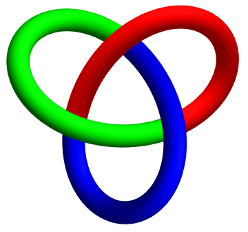A tricoloring of a knot is a way of coloring the arcs of a knot so that at every crossing, either all three arcs involved are the same color or all of them are distinct colors. If a knot is tricolored before a Reidemeister move, then there’s a way to fix the colors after the move so that it’s still tricolored. Tricolorability is a knot invariant, since you can either tricolor a given knot in all of the ways you can position it or none of them. Our picture shows the trefoil knot is tricolorable while the unknot is not, so this is one way to tell them apart!