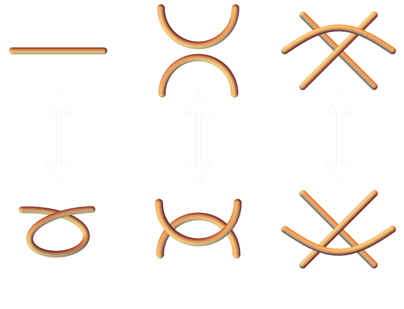 The trefoil knot is the simplest knot that’s not the unknot. The trefoil to the right has been colored in a strange but useful way. Consider maneuvers we make when trying to untangle a knot. If we lay a knot on a table as we work to untangle, we might note that the things we’re doing are essentially combinations of three types of moves: adding or removing twists from a strand, overlapping or un-overlapping two strands, and moving a strand from one side of a crossing to another. These three maneuvers are called Reidemeister moves and if you can maneuver one knot into another, you can do it using only these three moves.