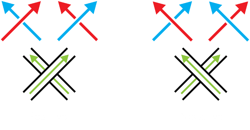 To compute these numbers, color one edge of the ribbon red, the other edge blue, and and the center line green, and give them all the same orientation. is the number of red/blue positive crossings minus negative crossings, divided by 2. is the number of green positive crossings minus negative crossings. (These two must be computed from the same perspective!) is the number of full twists in the band – i.e., half the number of what we’ve called twists. Counterclockwise twists are positive and clockwise twists are negative.