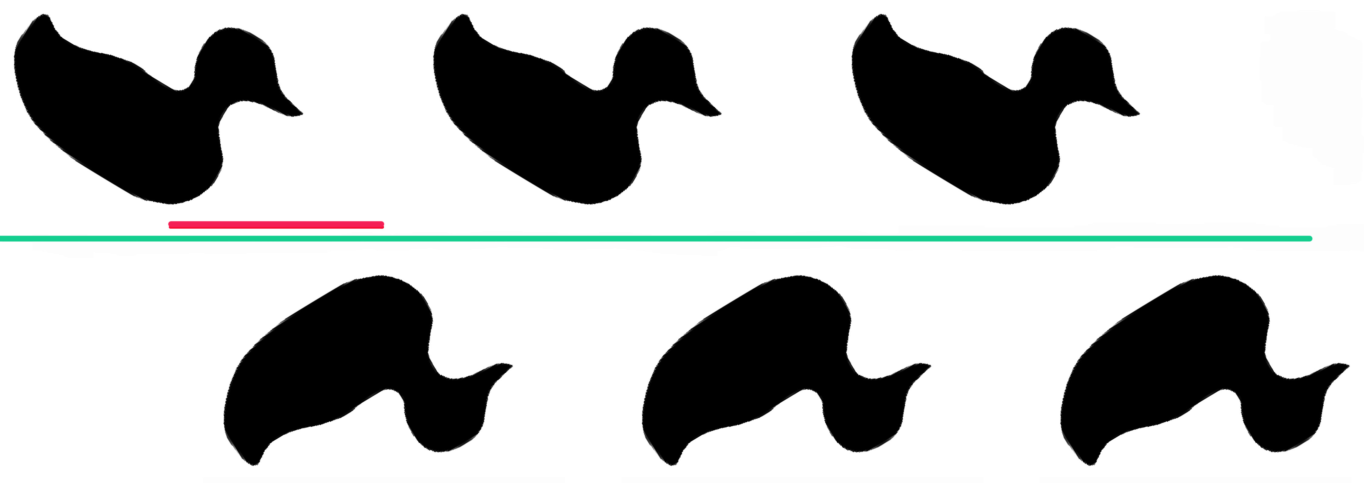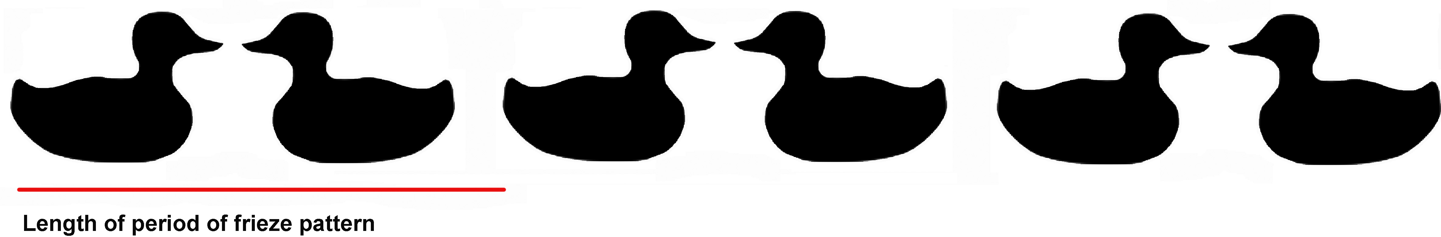 In this frieze pattern of ducks, two facing ducks were placed on the roller. The red line is equal to the circumference of the roller, and its length is the period of the pattern.