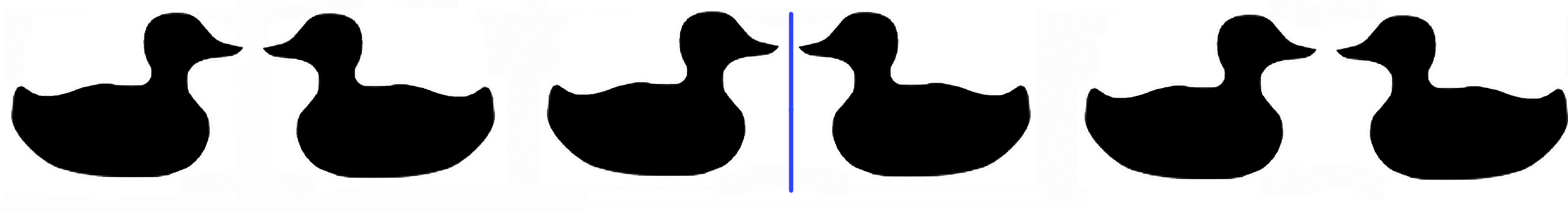 If this duck pattern is flipped around the blue line, the duck images will coincide. The vertical line acts as a mirror, reflecting ducks on one side of the mirror onto ducks on the other side of the mirror. This pattern has vertical reflection symmetry