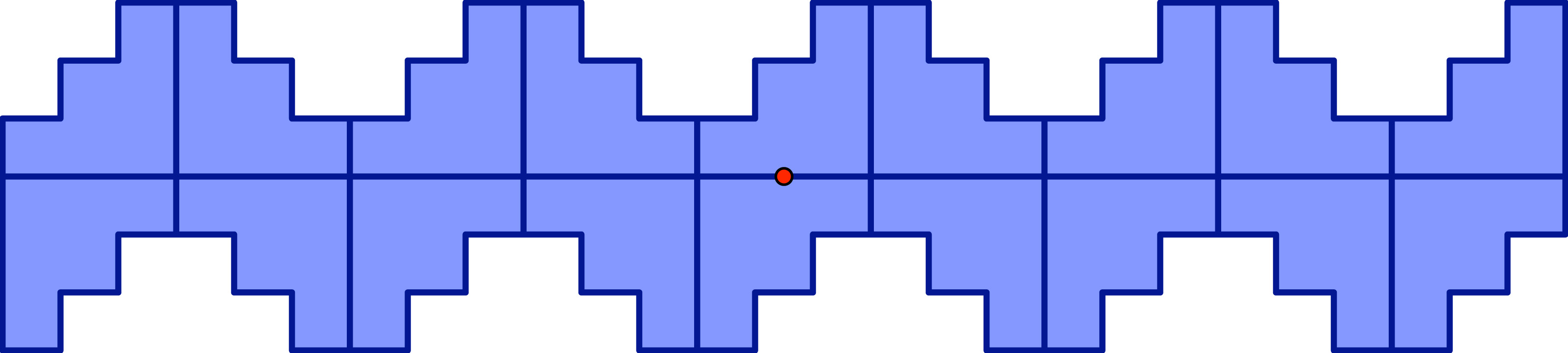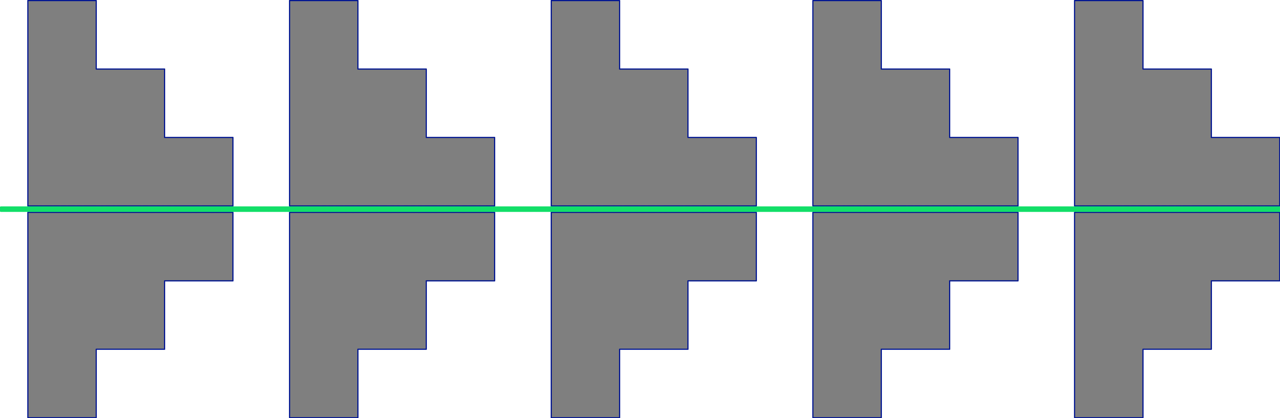 Here is a frieze pattern made with the step shapes. The pattern has horizontal reflection symmetry. The green line is the center line of the pattern, and acts like a mirror.