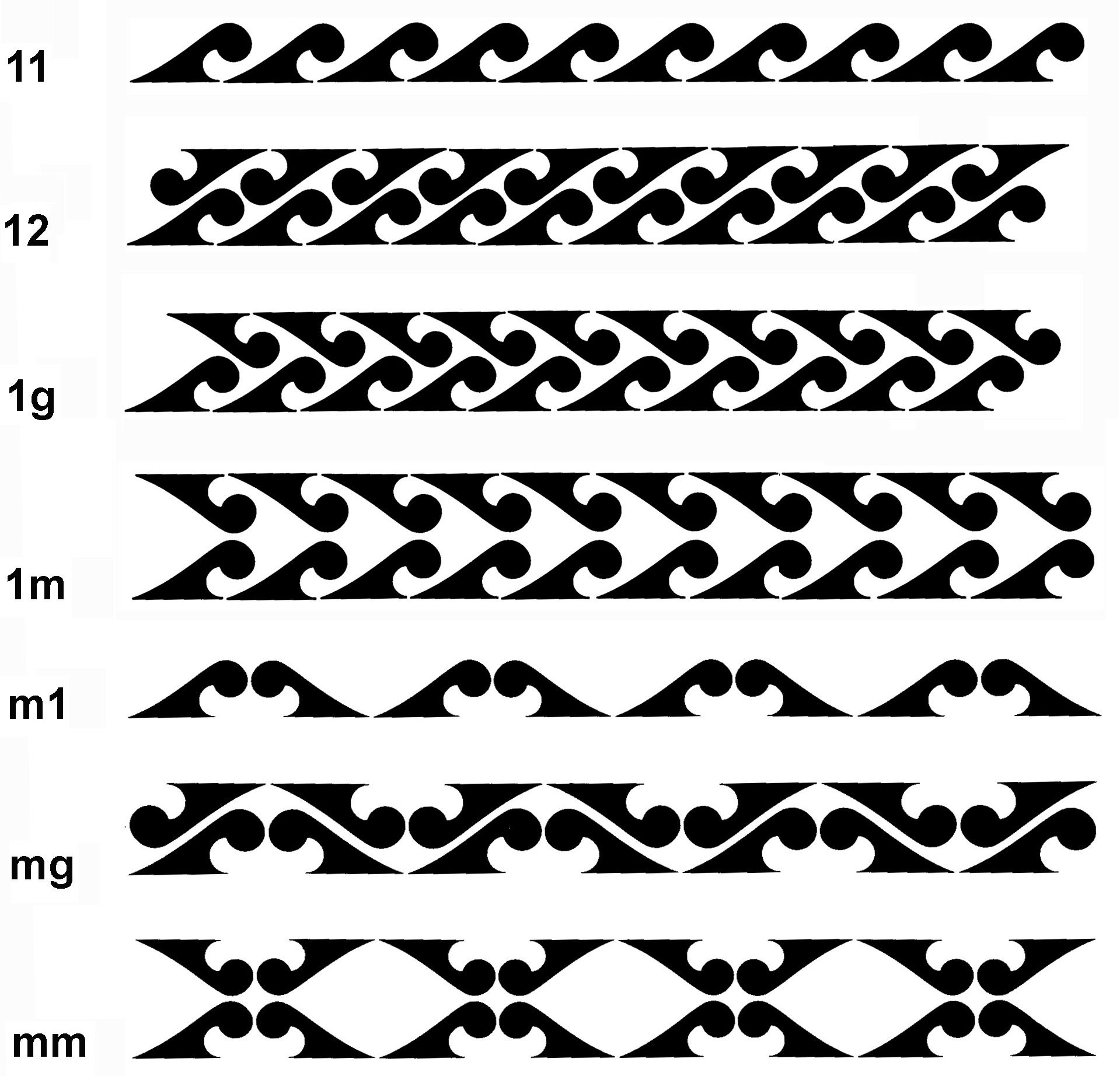 A periodic frieze pattern must have translation symmetry, but may have in addition one or more of these: 2-fold rotation symmetry, horizontal reflection symmetry, vertical reflection symmetry, glide-reflection symmetry. Although there are infinite design possibilities for frieze patterns, they can be sorted into exactly seven classes (types) according to their symmetries. Mathematicians have given each type a short 2-symbol name.